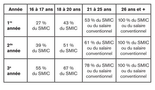 Il existe pour chaque tranche d’âge un salaire minimum légal correspondant à un pourcentage du SMIC en vigueur au 1er janvier. Dans certaines branches, en application de la convention collective dont dépend l’entreprise, la rémunération peut être supérieure au minimum légal.