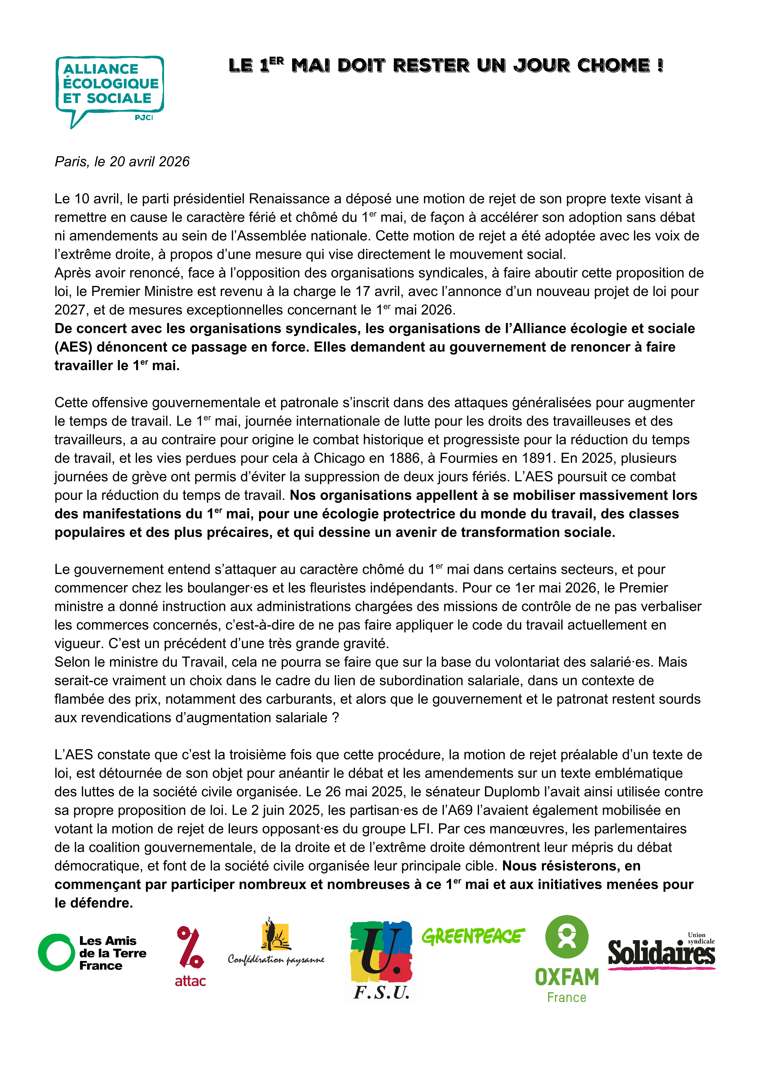De concert avec les organisations syndicales, les organisations de l’Alliance écologie et sociale (AES) dénoncent ce passage en force. Elles demandent au gouvernement de renoncer à faire travailler le 1er mai.