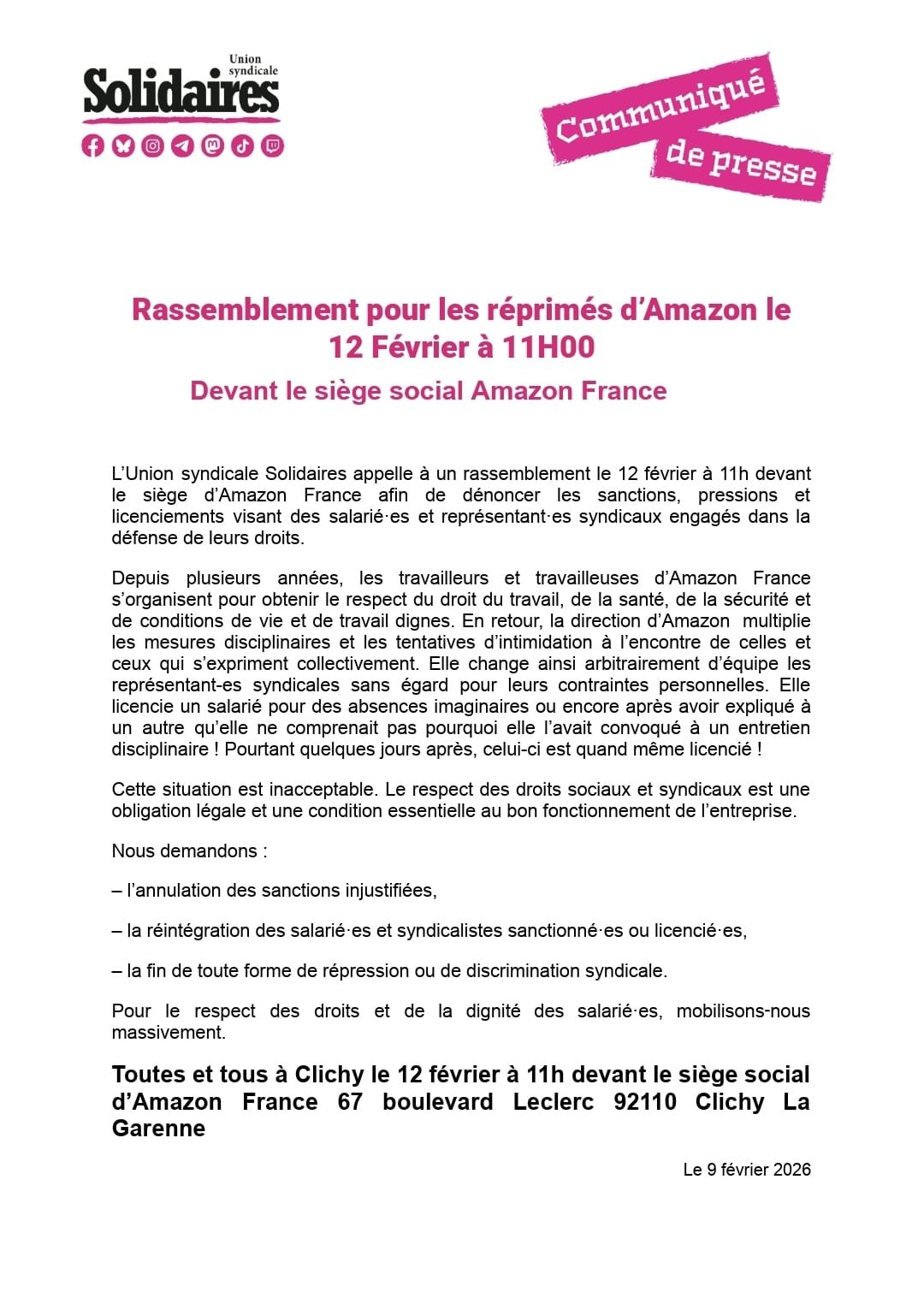 L’Union syndicale Solidaires appelle à un rassemblement le 12 février à 11h devant le siège d’Amazon France afin de dénoncer les sanctions, pressions et licenciements visant des salarié·es et représentant·es syndicaux engagés dans la défense de leurs droits.