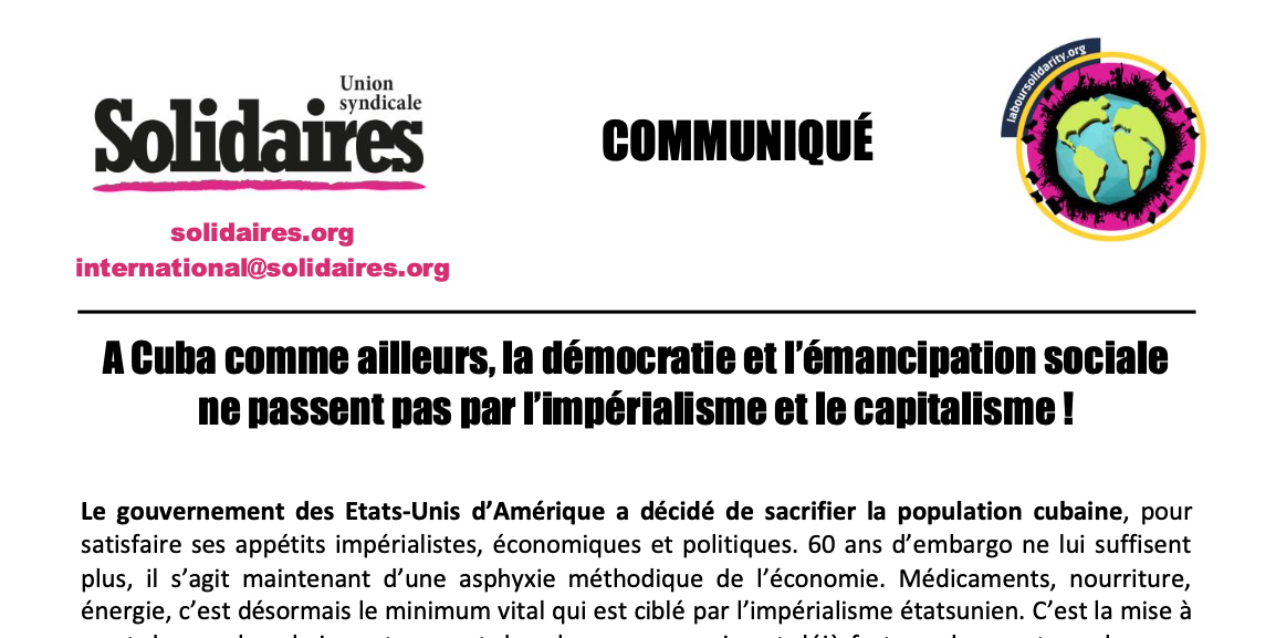 Syndicalistes, notre préoccupation, notre solidarité et le soutien que nous pouvons apporter concernent les travailleurs et travailleuses, le peuple. La centrale syndicale unique cubaine est intégrée à l’Etat. Ce n’est pas le syndicalisme dont nous nous revendiquons. Sur le plan des libertés et des ressources pour vivre, la situation est catastrophique. Mais, à Cuba comme ailleurs, ce n’est pas à des Etats impérialistes de venir faire régner leur loi, qui ne vise nullement à améliorer les choses pour notre classe sociale.