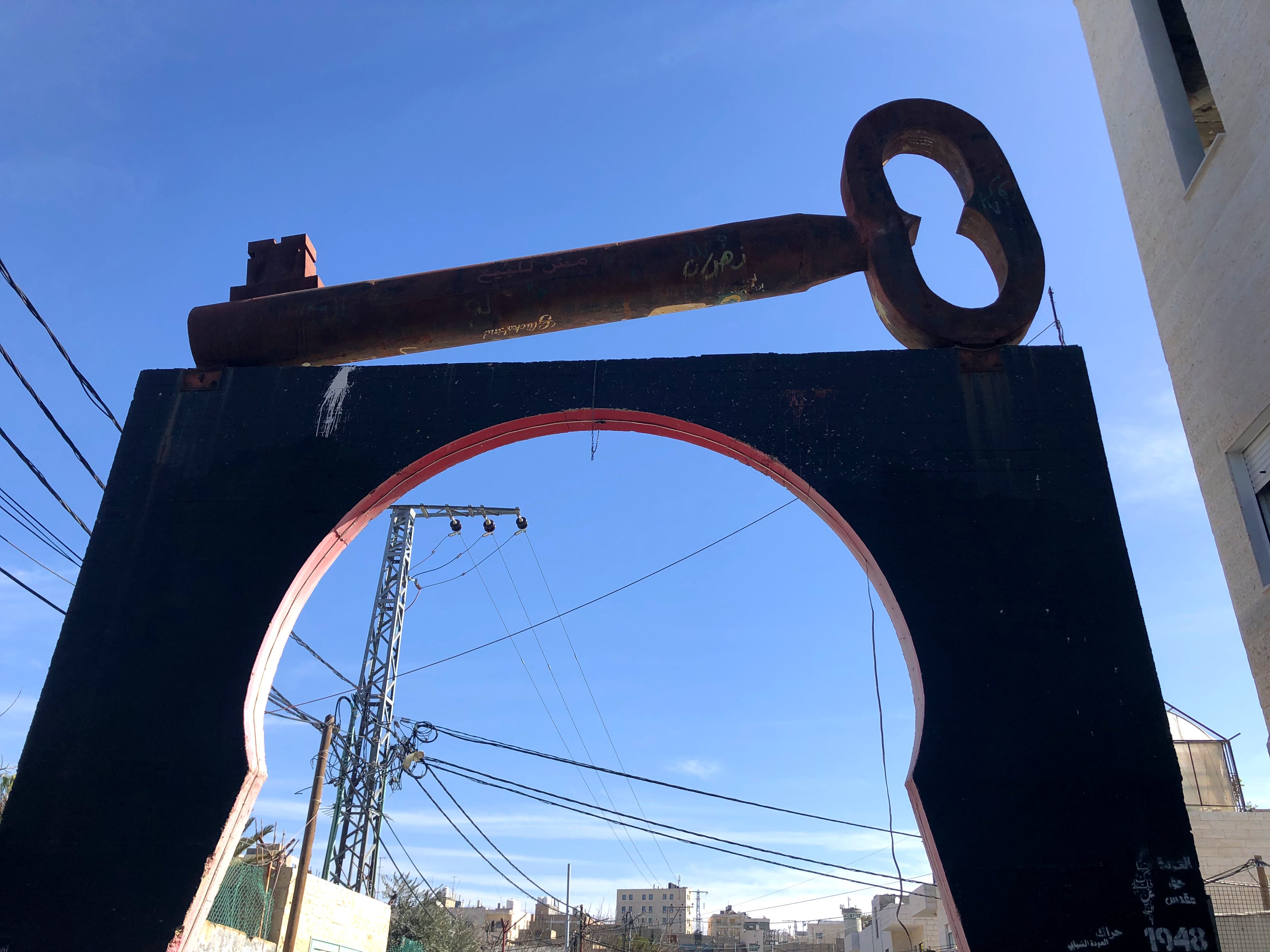 3 : L’entrée du camp de réfugiés d'Aïda, près de Bethléem : la clé est le symbole du droit au retour des réfugié-es palestiniens dans leur maison après leur expulsions à différents moments de l’histoire.