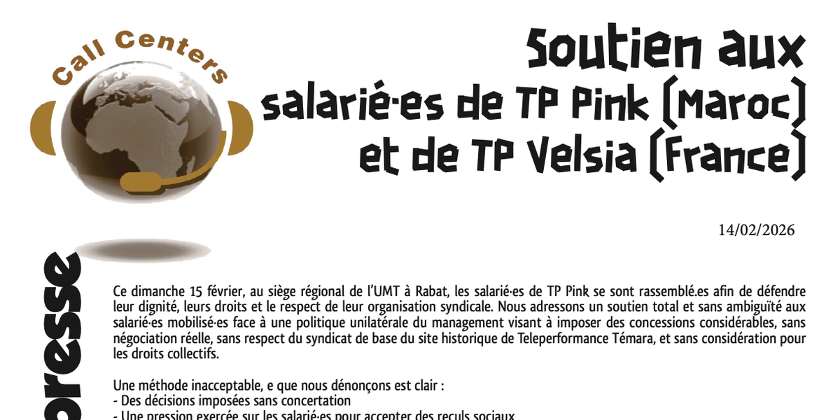 Ce dimanche 15 février, au siège régional de l’UMT à Rabat, les salarié·es de TP Pink se sont rassemblé.es afin de défendre leur dignité, leurs droits et le respect de leur organisation syndicale. Nous adressons un soutien total et sans ambiguïté aux salarié·es mobilisé·es face à une politique unilatérale du management visant à imposer des concessions considérables, sans négociation réelle, sans respect du syndicat de base du site historique de Teleperformance Témara, et sans considération pour les droits collectifs.