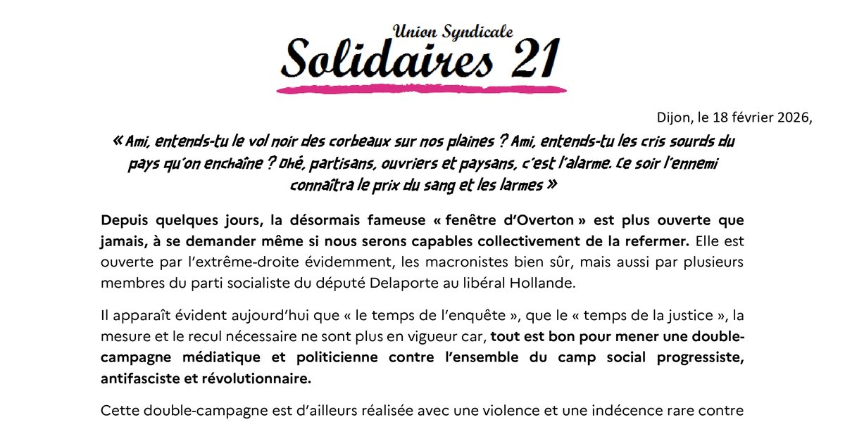 Dans un silence médiatique et politique total, des agressions physiques de l’extrême-droite se déchaînent contre des camarades, des locaux syndicaux sont attaqués tout comme des locaux politiques. Dans cette situation et plus que jamais, nous devons faire front, collectivement, de manière solidaire. Le combat n’est pas perdu mais il va être rude alors, dans nos entreprises, dans nos administrations, dans nos manifestations, dans la rue, relevons la tête et faisons bloc !