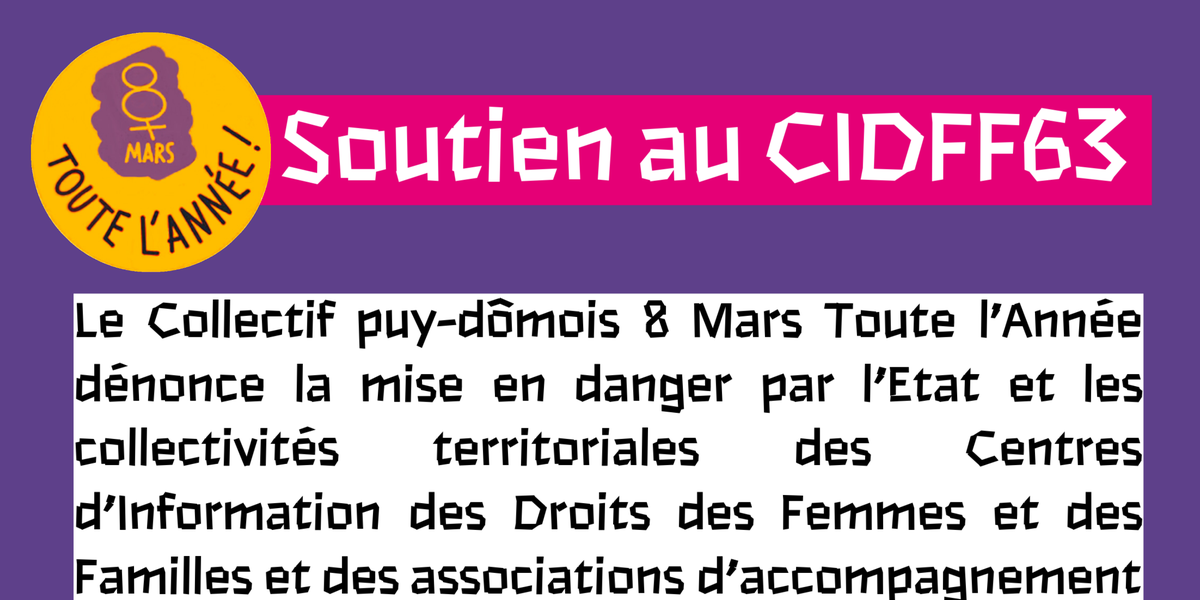 Le Collectif puy-dômois 8 Mars Toute l'Année dénonce la mise en danger par l’Etat et les collectivités territoriales des Centres d’Information des Droits des Femmes et des Familles et des associations d’accompagnement des femmes de manière générale. Le collectif apporte également son soutien aux salariées qui vivent de fait une situation difficile. Aujourd’hui, sans action de la part de l’Etat et des collectivités territoriales, le CIDFF63 ne pourra pas payer les salaires dès ce mois de juillet. C’est plus de 3000 femmes accompagnées par an qui se retrouveront sans soutien et 12 salariées qui verront leur emploi menacé.