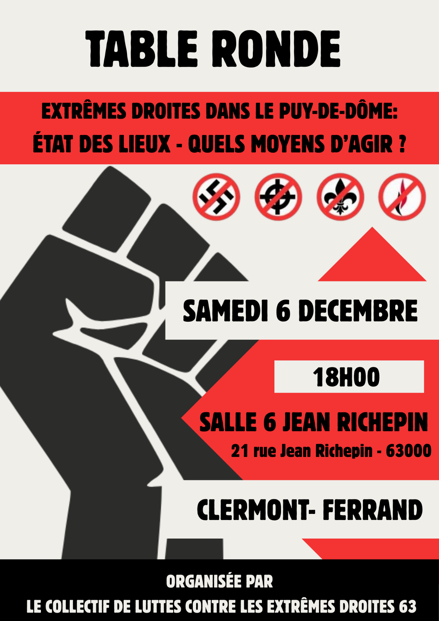 Le Collectif de lutte contre les extrêmes droites du Puy de Dôme LCED 63, collectif de 27 organisations syndicales, politiques et associatives, dont Solidaires est membre fondateur, organise samedi prochain 6 décembre à 18 heures, au centre Jean Richepin (salle 4) une réunion publique destinée à faire le point sur les extrêmes droites du département et les moyens de les combattre.