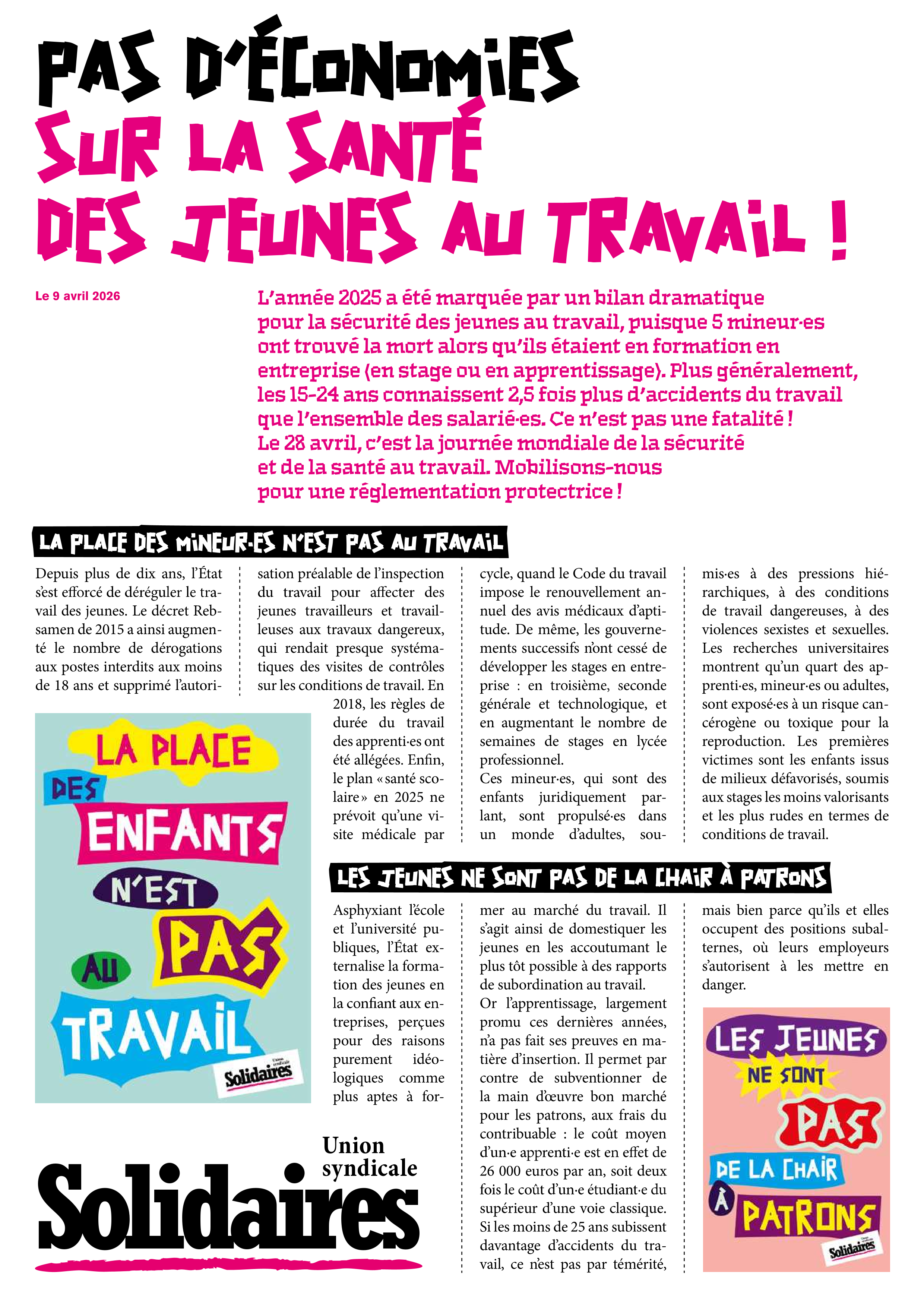 L’année 2025 a été marquée par un bilan dramatique pour la sécurité des jeunes au travail, puisque 5 mineur·es ont trouvé la mort alors qu’ils étaient en formation en entreprise (en stage ou en apprentissage). Plus généralement, les 15-24 ans connaissent 2,5 fois plus d'accidents du travail que l’ensemble des salarié∙es. Ce n’est pas une fatalité ! Le 28 avril, c’est la journée mondiale de la sécurité et de la santé au travail. Mobilisons-nous pour une réglementation protectrice !