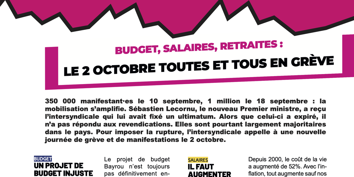 Le projet de budget Bayrou n’est toujours pas définitivement enterré. Lecornu n’a toujours pas indiqué travailler à un budget de justice fiscale qui mettrait à contribution les plus hauts revenus au lieu de présenter la facture aux travailleurs et travailleuses. De plus, il refuse de dire qu’il renonce à l’année blanche. L’année blanche c’est, en euros constants, la baisse des salaires dans la Fonction publique et la diminution des prestations sociales (pensions de retraites, APL, RSA, AAH…).