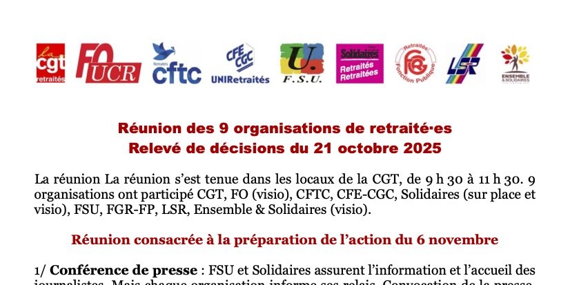 Cette action a été décidée par les organisations de retraité·es CGT, CFTC, CFE-CGC, FSU, Solidaires, FGR-FP, LSR, Ensemble & Solidaires, pour s’opposer au budget d’austérité du gouvernement qui vise en priorité les retraité·es.