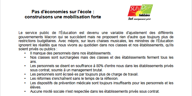 Dans l'enseignement, le SUNDEP Solidaires défend le service public d'Éducation et revendique :