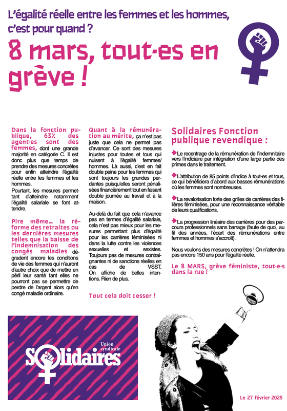C'est pourquoi l'Union Syndicale Solidaires et le Planning familial appellent ensemble avec d'autres syndicats et collectifs féministes à la grève féministe ce 8 mars 2025.
