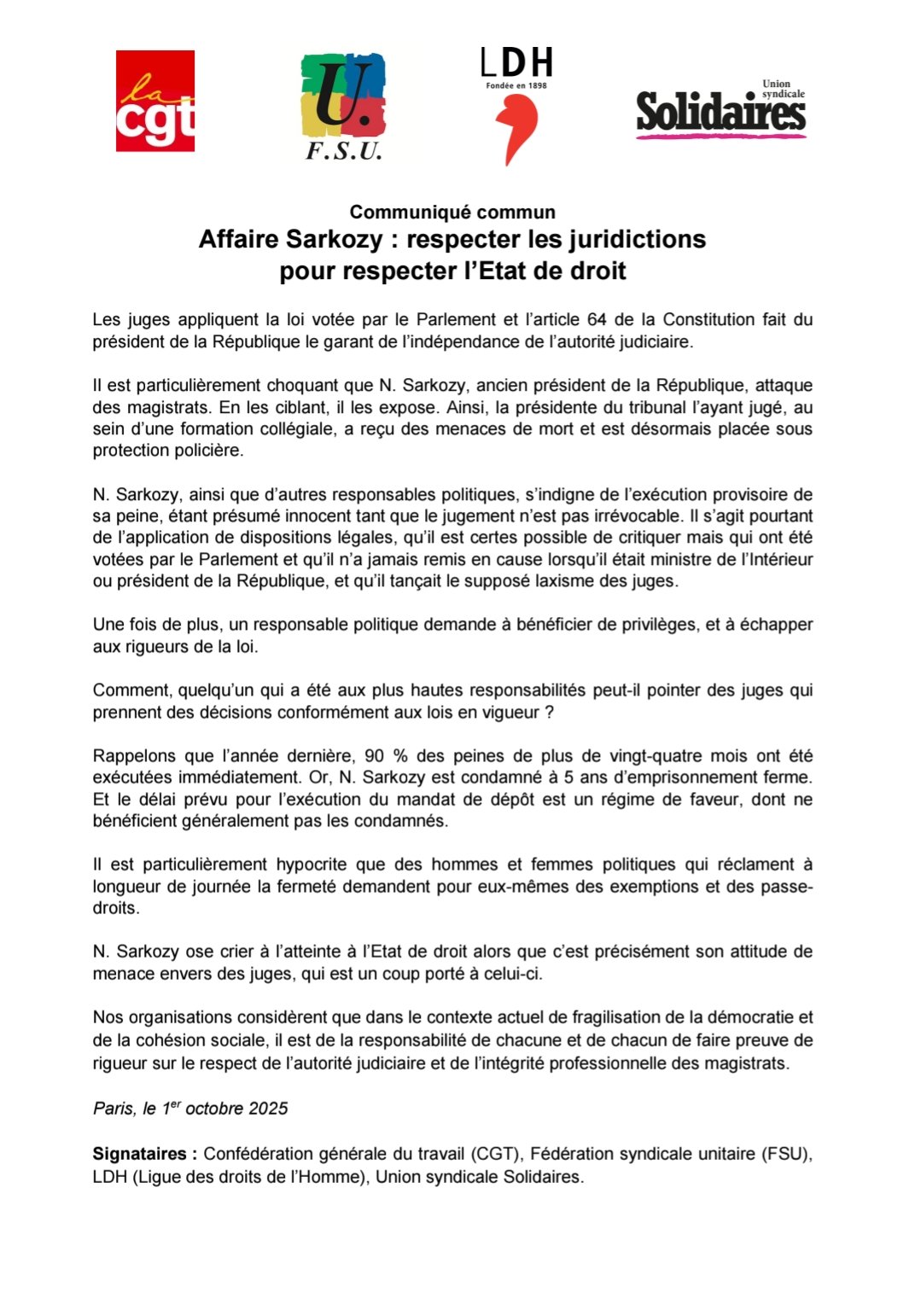 Nos organisations considèrent que dans le contexte actuel de fragilisation de la démocratie et de la cohésion sociale, il est de la responsabilité de chacune et de chacun de faire preuve de rigueur sur le respect de l’autorité judiciaire et de l’intégrité professionnelle des magistrats.