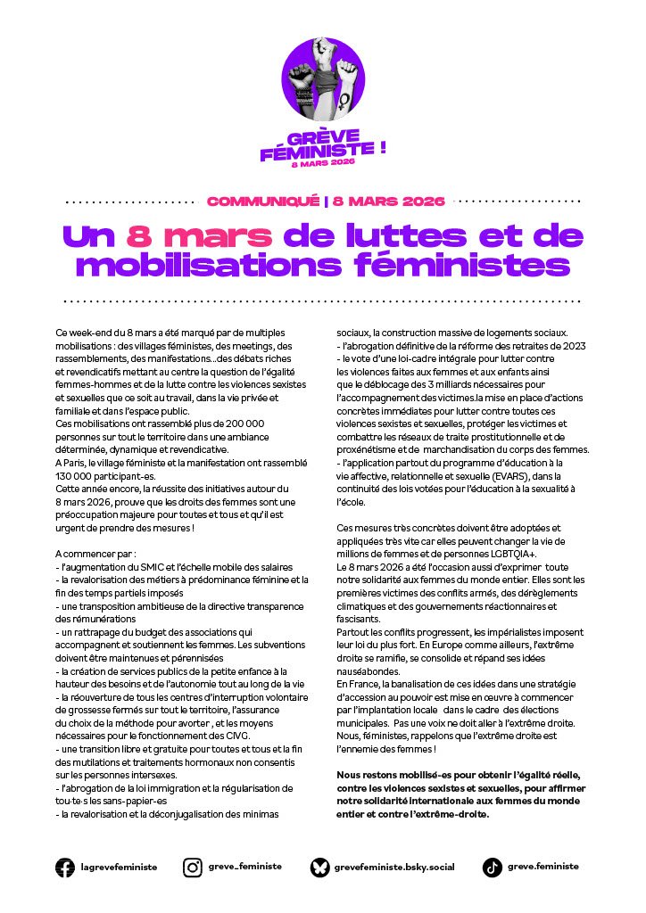 Nous restons mobilisé-es pour obtenir l’égalité réelle, contre les violences sexistes et sexuelles, pour affirmer notre solidarité internationale aux femmes du monde entier et contre l’extrême-droite.