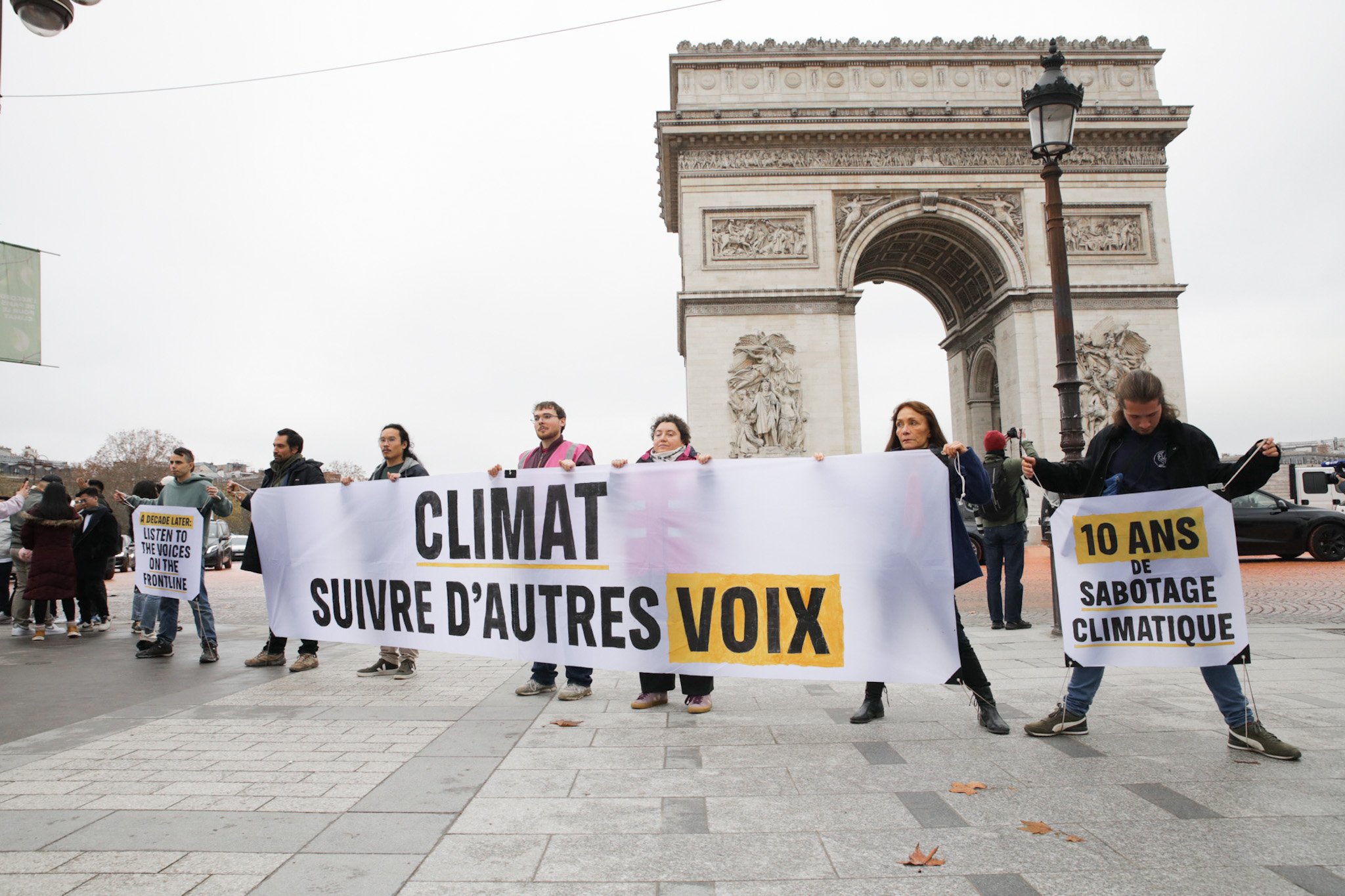 En ce dixième anniversaire de l’accord de Paris, des activistes d’Action non-violente COP21, d’Action Justice Climat et de Greenpeace France ont déversé ce matin de la peinture orange sur la Place Charles-de-Gaulle, anciennement place de l’Etoile, pour alerter sur l’invisibilisation persistante des populations les plus touchées par la crise climatique.