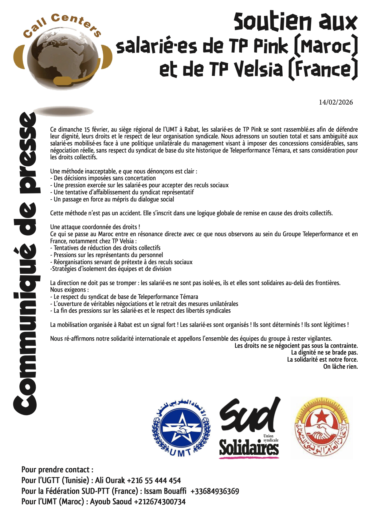 Ce dimanche 15 février, au siège régional de l’UMT à Rabat, les salarié·es de TP Pink se sont rassemblé.es afin de défendre leur dignité, leurs droits et le respect de leur organisation syndicale. Nous adressons un soutien total et sans ambiguïté aux salarié·es mobilisé·es face à une politique unilatérale du management visant à imposer des concessions considérables, sans négociation réelle, sans respect du syndicat de base du site historique de Teleperformance Témara, et sans considération pour les droits collectifs.
