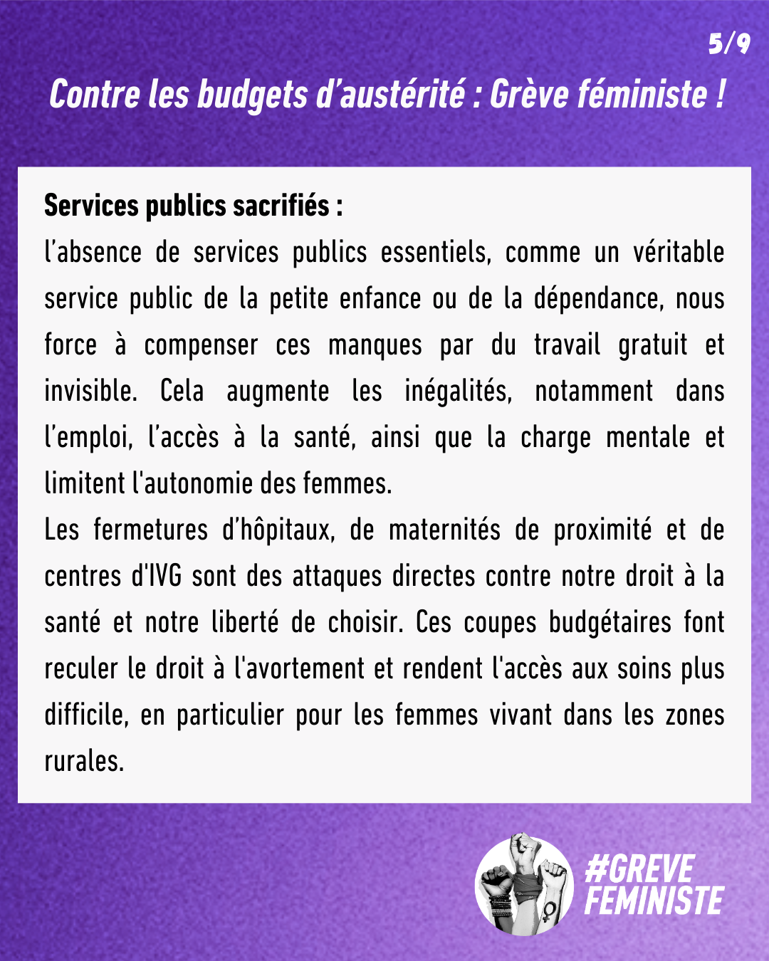 Les politiques d'austérité du gouvernement, qui touchent l'ensemble des travailleuses et travailleurs, des chômeuses et des chômeurs, des personnes touchant les minimas sociaux, ont un impact particulièrement violent sur les femmes. Ces coupes budgétaires amplifient des inégalités déjà criantes et fragilisent nos droits les plus fondamentaux.