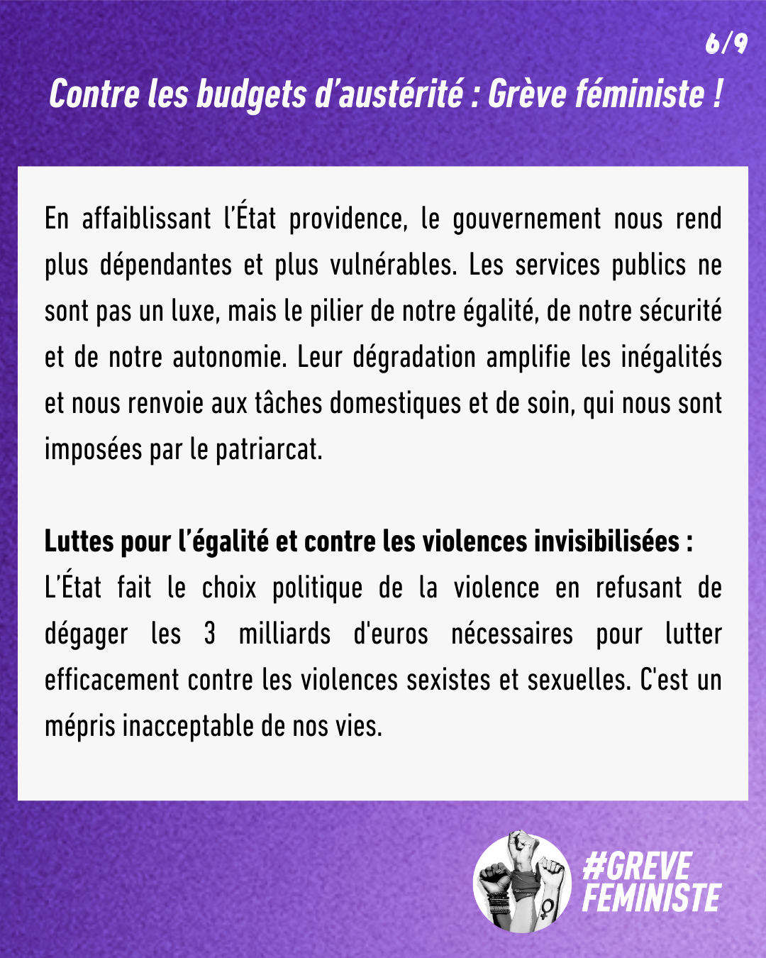 Les baisses de subventions infligées aux associations, notamment au Planning Familial et à toutes les structures qui viennent en aide aux femmes victimes de violences, ne sont pas de simples économies, ce sont des attaques directes contre notre sécurité, notre dignité, nos vies. Ces coupes budgétaires affaiblissent des structures de soutien essentielles, qui pallient souvent les carences des services publics. En ciblant ces associations, le gouvernement rend encore plus difficile l'accès aux droits fondamentaux : l'accès à la santé sexuelle et reproductive, la prise en charge psychologique et juridique des victimes de violences sexistes et sexuelles, ainsi que la prévention. Il invisibilise notre lutte et nous prive des outils pour nous défendre et nous reconstruire