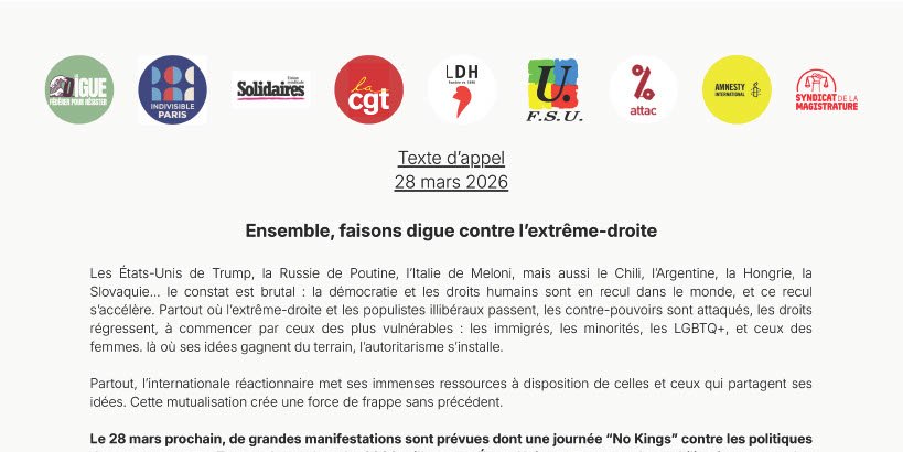 Le 28 mars 2026, de grandes manifestations sont prévues dont une journée “No Kings” contre les politiques du gouvernement Trump dans plus de 2000 villes aux Etats-Unis et une grande mobilisation contre les politiques du gouvernement Meloni en Italie.
