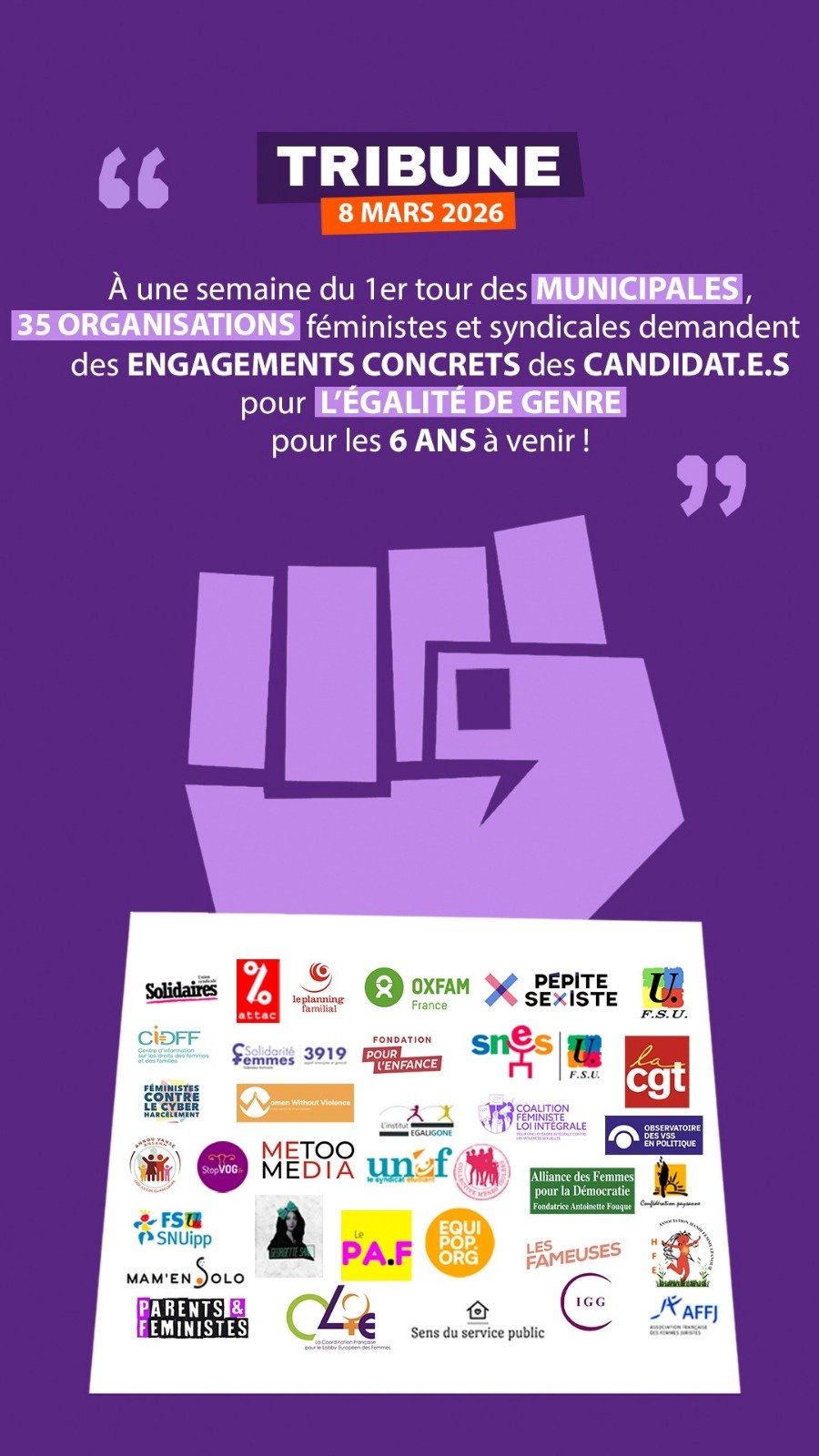 À l’heure où les discours réactionnaires progressent, nous interpellons solennellement les futur·e·s élu·e·s : l’égalité et la lutte contre les violences ne sont pas un supplément d’âme. Elles sont au cœur des politiques de justice sociale. Elles doivent donc être une priorité politique des six prochaines années.