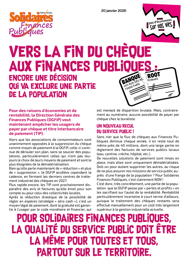 La fin des chèques aux Finances Publiques : encore une décision qui va exclure une partie de la population !