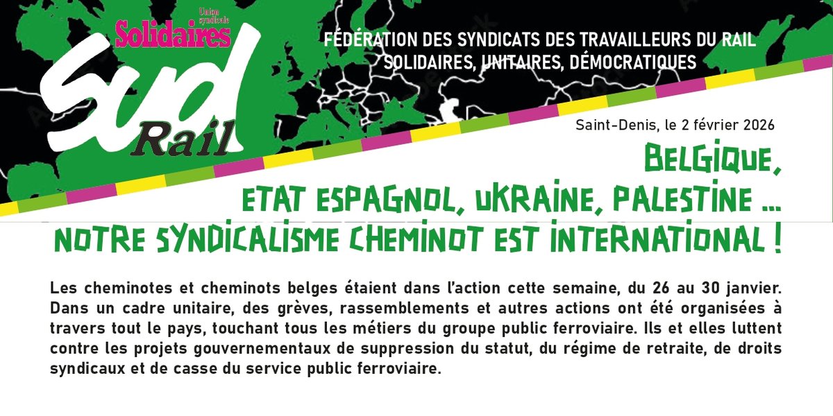 Belgique, Etat Espagnol, Ukraine, Palestine ... notre syndicalisme cheminot est international ! Vous trouverez une expression fédérale qui revient sur nos actions syndicales et internationalistes du côté de la fédération SUD-Rail.