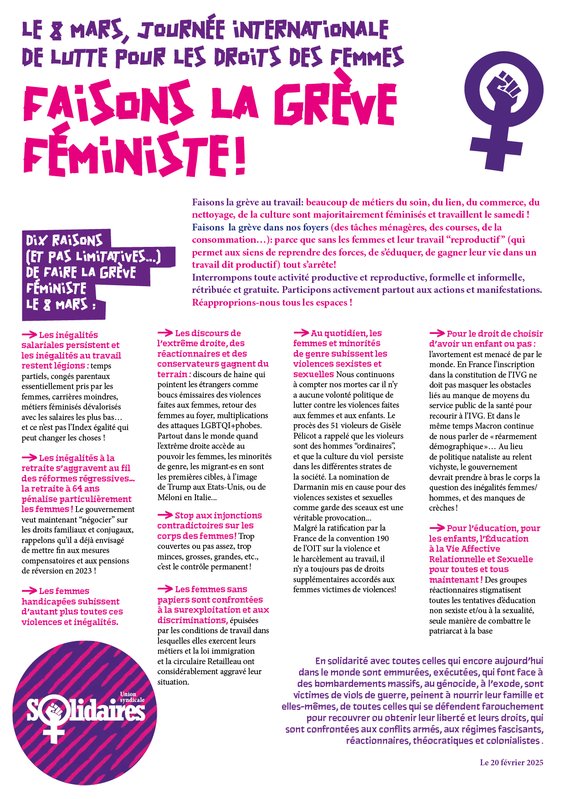 C'est pourquoi l'Union Syndicale Solidaires et le Planning familial appellent ensemble avec d'autres syndicats et collectifs féministes à la grève féministe ce 8 mars 2025.
