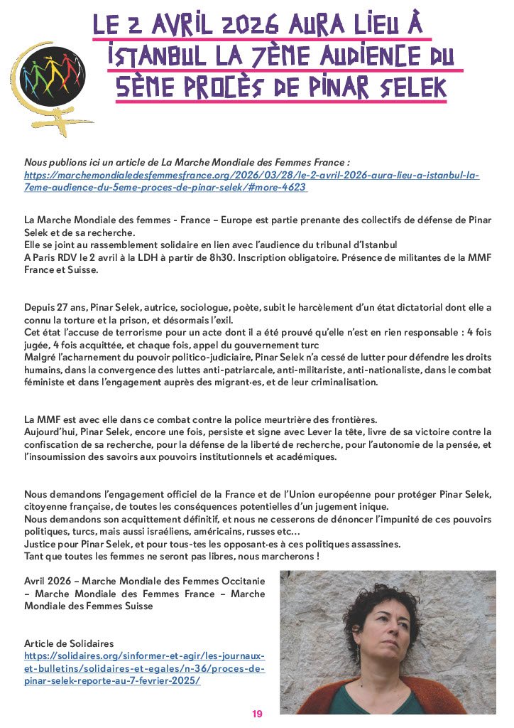 Nous publions ici un article de La Marche Mondiale des Femmes France : https://marchemondialedesfemmesfrance.org/2026/03/28/le-2-avril-2026-aura-lieu-a-istanbul-la-7eme-audience-du-5eme-proces-de-pinar-selek/#more-4623
