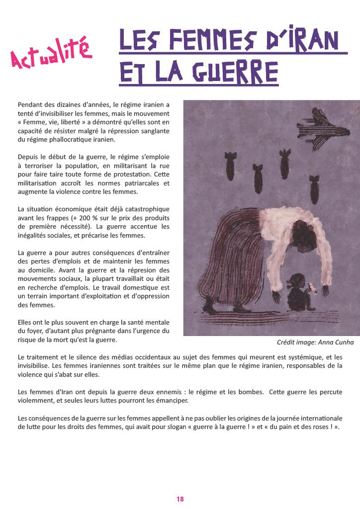 Cette guerre les percute violemment, et seules leurs luttes pourront les émanciper. Les conséquences de la guerre sur les femmes appellent à ne pas oublier les origines de la journée internationale de lutte pour les droits des femmes, qui avait pour slogan « guerre à la guerre ! » et « du pain et des roses ! ».