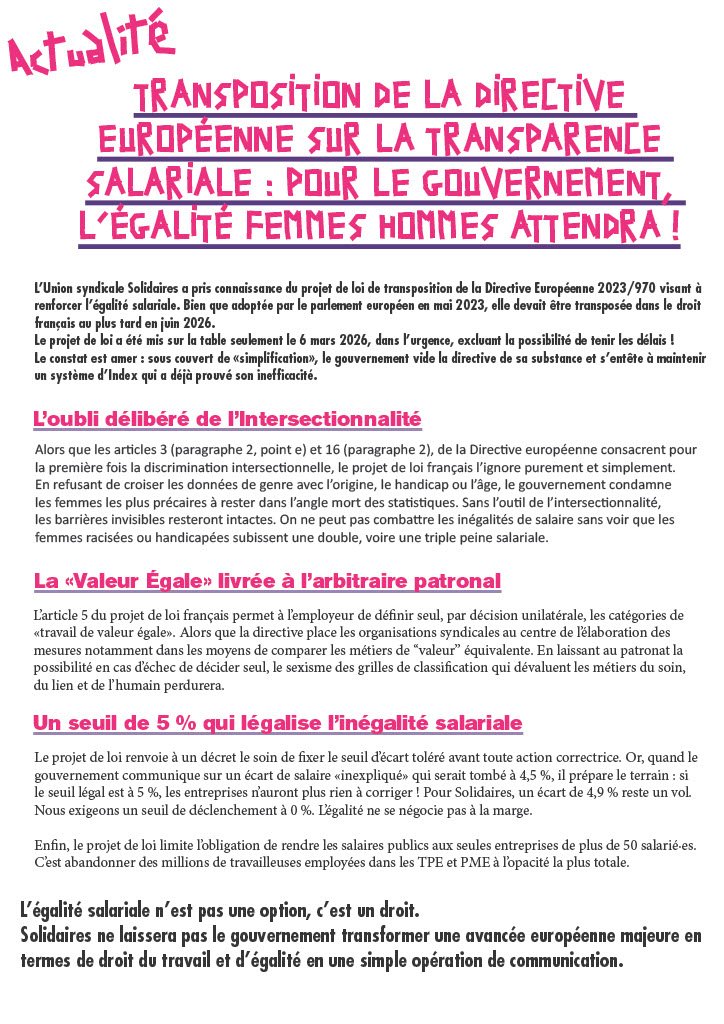 L’Union syndicale Solidaires a pris connaissance du projet de loi de transposition de la Directive Européenne 2023/970 visant à renforcer l’égalité salariale. Bien que adoptée par le parlement européen en mai 2023, elle devait être transposée dans le droit français au plus tard en juin 2026.